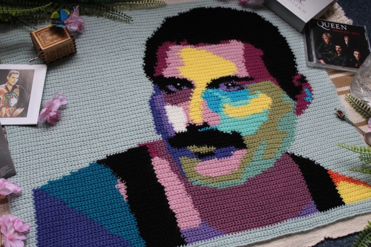 After this whole thing I felt it was time for some me-time. I wanted to crochet something for myself. And i came up with something which is really important for me. Music always gives comfort, when you need happiness or you feel sad…music feeds the soul in many ways. One of the most important things in my life as long as i can remember, but more importantly the last months is the music of Queen. And more specific Freddie Mercury. He has been an example for me for a long time. It was a man with good and bad habits, not perfect and surely he could have done some things in a better way. But who doesn’t ? More important is his courage to show the world what he could accomplish by his talent and showing off he dared to be different. These last two things are the greatest example for me. I try to show off men can also crochet to all of those who still feel it is more a women’s thing. And i try to show off that if you’ll let your creativity loose you can reach and make out wonderful things. And maybe I do understand Freddie better now as the dark side of life was something he also had to face due his last years. Anyway, it was no hard choice to make him out of yarn as a tribute. And it just came out. I really didn’t think too much about it and just did it. And i was almost emotional when i saw his face come to life in my living room. By the time it was finished i felt i had Freddie besides me watching at me with his sparkling eyes and big mustache.