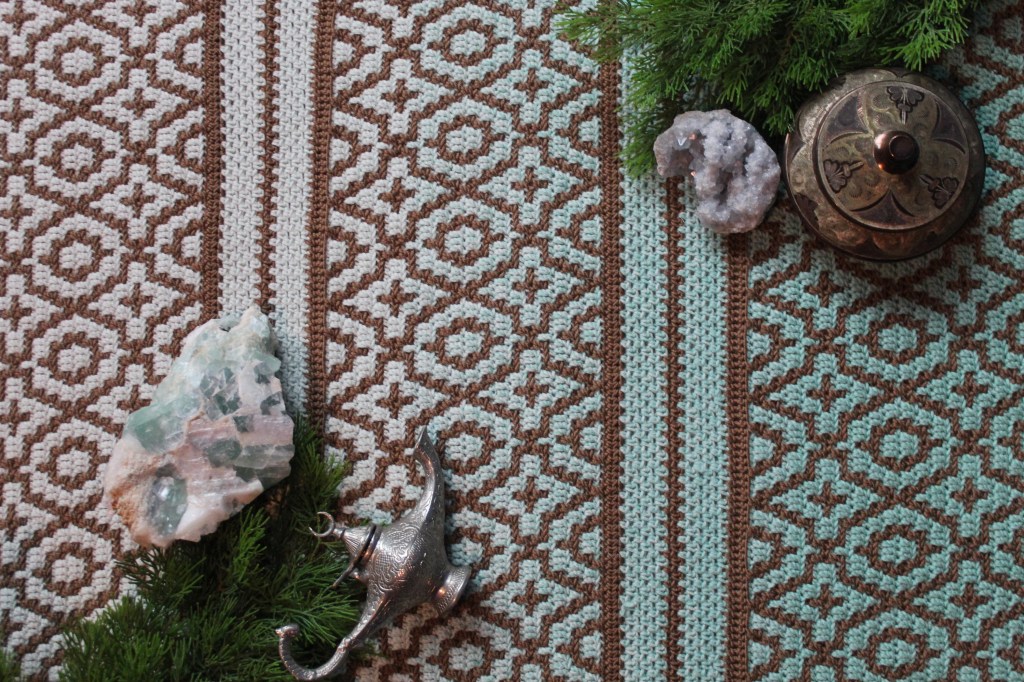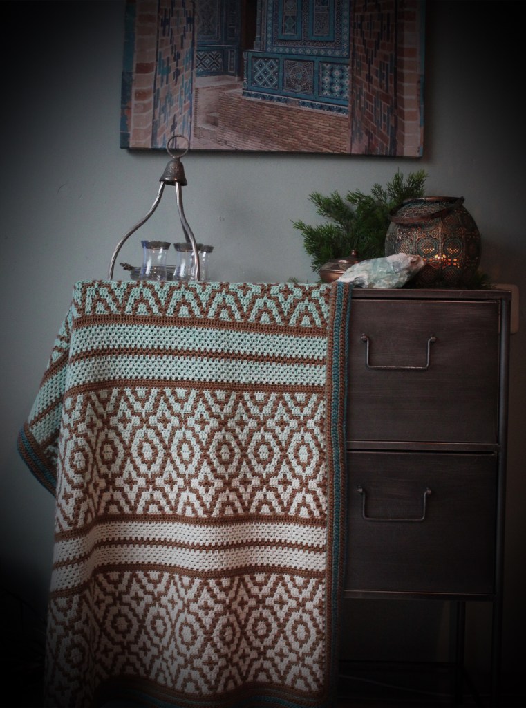 Karadeniz Kilim is a mosaic crochet pattern that is inspired by Ottoman designs. Especially in the region around the Black Sea, these tiles and decorated buildings can be found, which form a rich inspiration for these types of designs. I gave this pattern a Turkish name as similar forms from this design were found in Istanbul when I visited it. Karadeniz means “The Black Sea”- or the region around the Black Sea, and Kilim means rug. This pattern is designed as a small rug – but the options are endless. This pattern is straightforward to adjust in size. For that reason, it can be easily changed to a blanket, table runner, baby blanket, or cushion.
