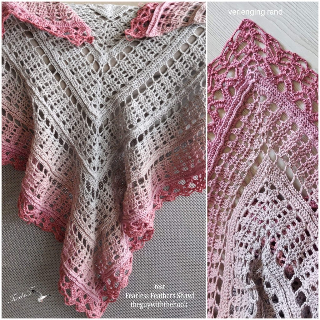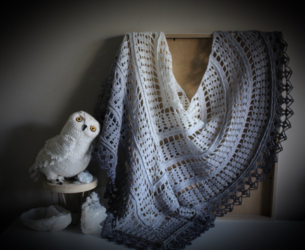Fearless Feathers is a very lacy shawl full of tiny feathers, giving the shawl the look of two bird wings folding over each other. As colder weather is approaching, I thought it would be nice to release a shawl pattern once again – although for myself I don’t often wear one. Although I designed this shawl with the idea of wings from a bird – many of you also suggested angel wings. And hey…that is also a great idea! So feel free to see in this design what you like to see! And…go crazy with colors! When picking colors, I took the snow owl (Hedwig from Harry Potter) in mind, but if you would take a parrot, why not go crazy on rainbow colors? The options are endless. The tension and design of the shawl are unique, other than the regular triangle-shaped ones, so the wing concept is expressed.