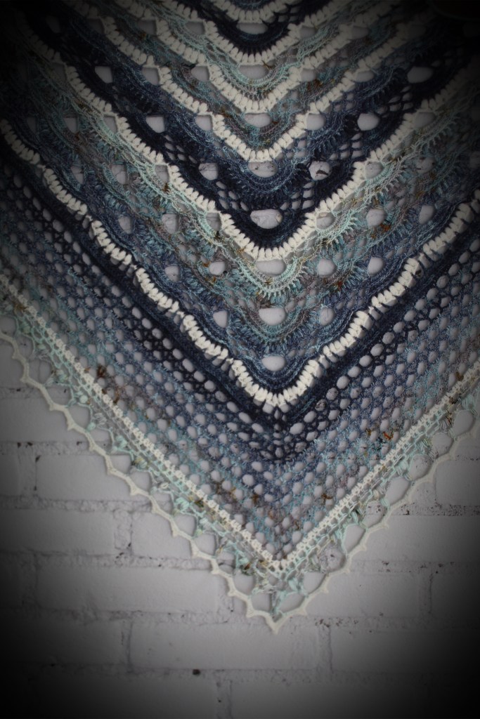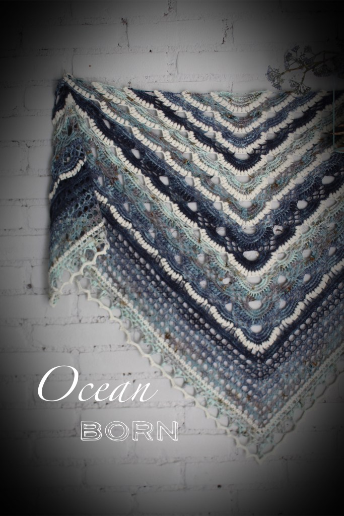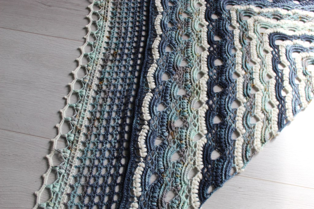 When visiting the shop of Stephen and Penelope in Amsterdam last year, I returned with some deliciously looking sock yarns. Although I can perfectly knit, I still prefer crocheting, and it came to my attention that most artistic patterns are made with knitting for sock yarns. So, I challenged myself to create something unique with the purchased yarns I took home from the store. As I had a combination of ocean-colored skeins, the theme was set. The result is a textured yet lace-looking shawl with a crochet pattern. Born out of the inspiration from the ocean.