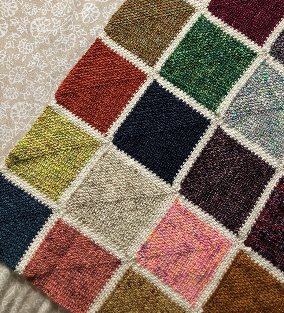 Meet the Scrappy Squares blanket, a pattern I’ve created to use up a pile of scrap yarn I have collected over time. When you knit, most of you will know a “Memory blanket.” This lovely pattern lets you create squares out of scrap yarns in a join-as-you-go method to create a blanket.
