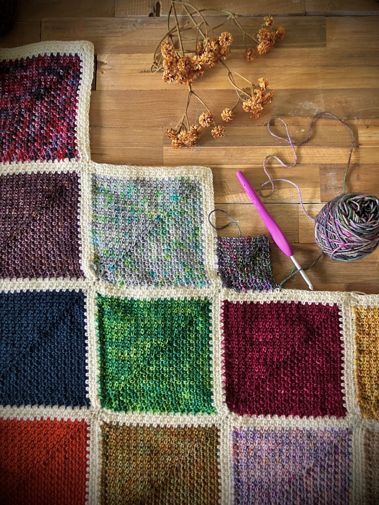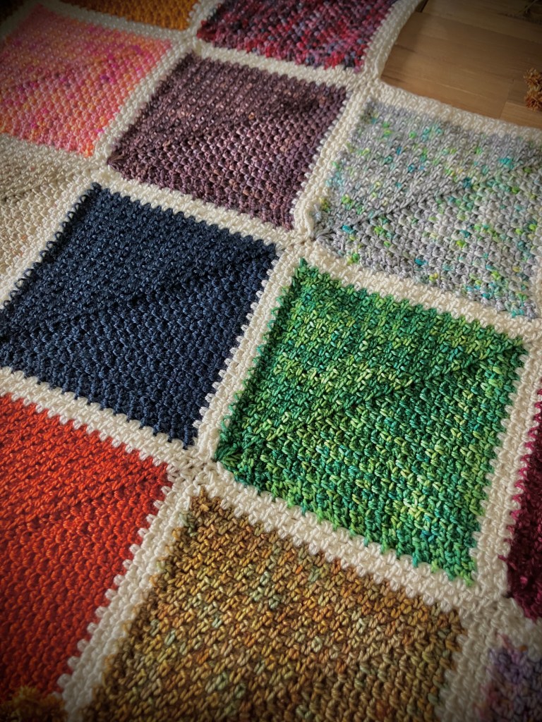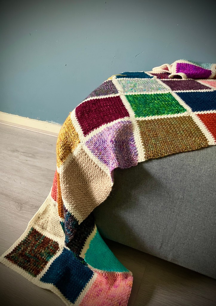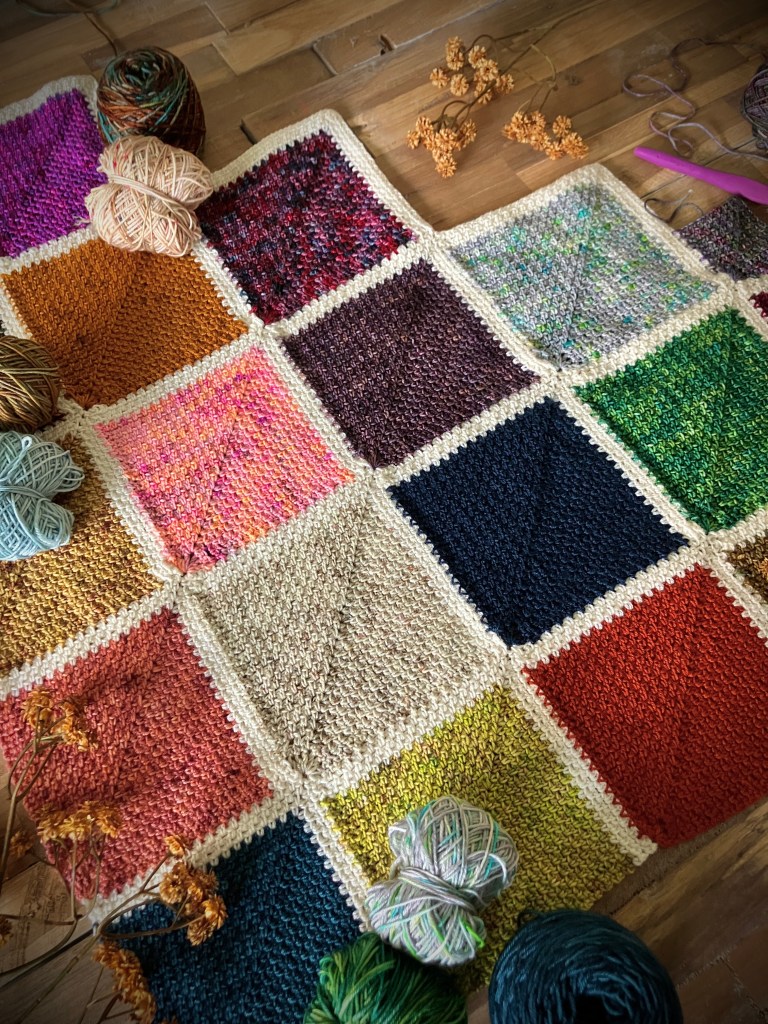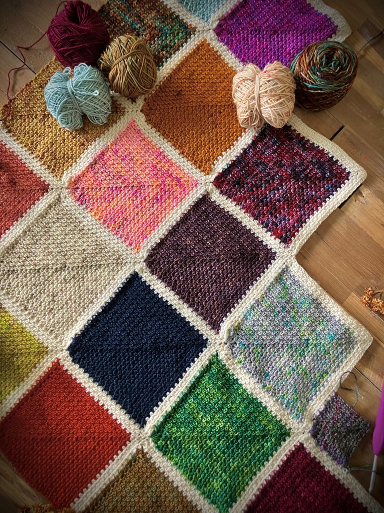 Be creative in combining colors next to each other, if you don’t have enough yarn left for one full square, maybe make a 50/50 square out of two small scraps. Anything is possible, and it is definitely the thing to be creative. The start of the pattern will be a learning curve, and you have to crochet some squares to get the concept and get it in your head….but once you’ve got it, off you go, and it is a very relaxing and satisfying thing to grab while watching or listening to something. You can make a challenge for yourself to make one square each day – or perhaps each week. And the size is limitless as you can grow and grow as big as you like.