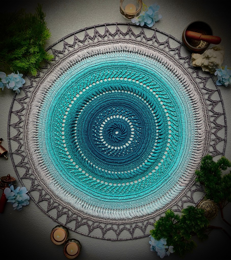 This pattern is your friend if you like a challenge in crochet stitches and texture. Feng Shui is based on the art of zen gardening, practiced by many Buddhists and something I first encountered in real life during my travels through Japan. The most beautiful lines and shapes are formed with a hoor in the gravel. Buddhist monks or carekeepers of temples often spend hours creating perfection in those gardens and you will see a result where it seems a natural pattern is created by nature as no footstep is left behind. It has been a great inspiration for me to watch this in real life and so this mandala was created. It will take you hours to complete and needs your entire focus—a meditative process similar to the art of zen gardening.