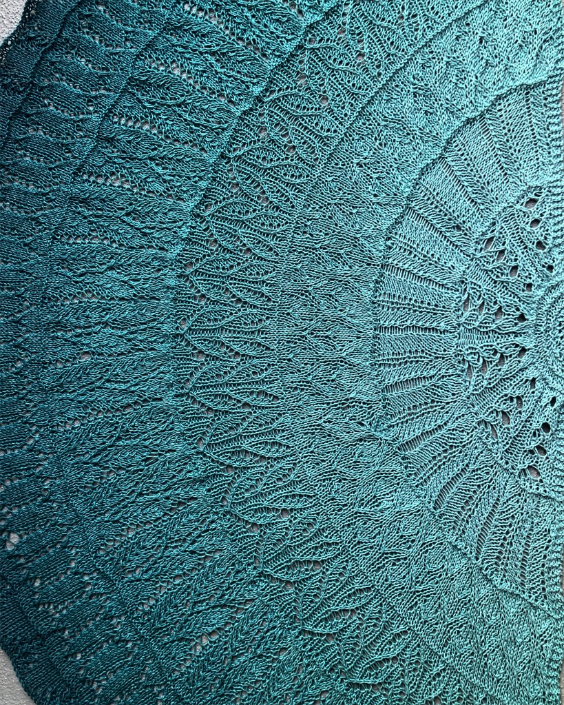 It is time for a new knitting pattern. Although many of you will only know me as a crochet designer, I actually knitted for over ten years before I started crocheting. I never felt the urge to design that much in knitting as I preferred crocheting, but lately, the need to knit between crocheting started rising. I also discovered that I like to experiment and create things on my own here. I have used many techniques in knitting over the years, and lace knitting has always been one of my favorites. So, to kick off a new line of knitting patterns coming up, I thought it might be a good idea to start with a lace project. Meet Lothlorien, a wonderful pi-shawl made out of one ball of gradient-colored yarn.