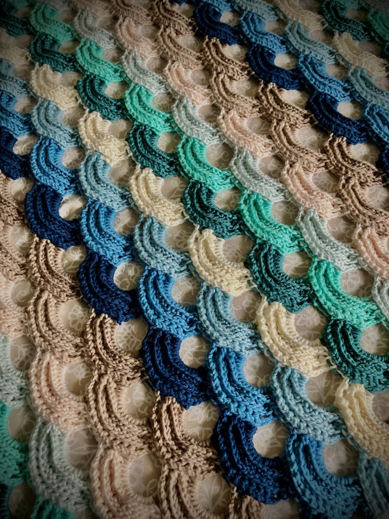 -As I chose to work with different colors, you crochet a set of waves, fasten off, and change to a different color. If you decide to use a solid color or a gradient type of color, you can crochet on and on by turning the work and not fastening off the yarn.