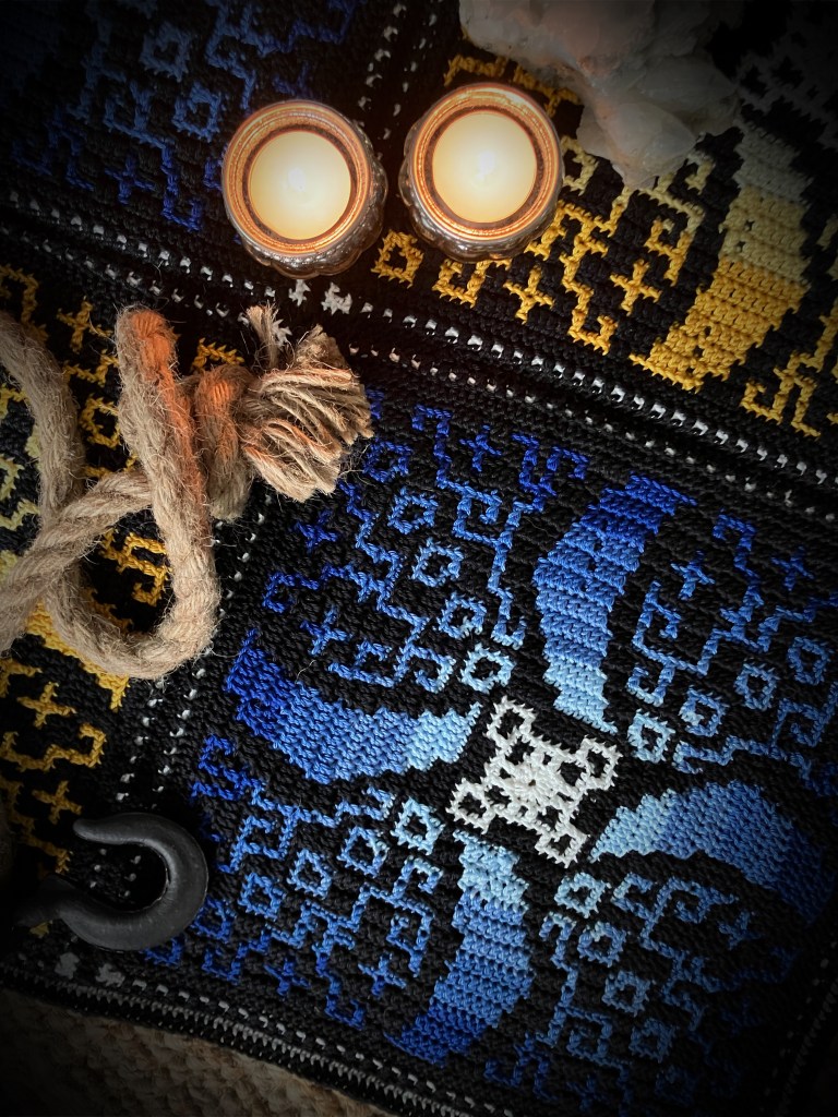 A new pattern is here! It is the Celestial Tiles, a new mosaic crochet tile pattern. It is the seventh tile from my hand, and it is completely new, featuring a different size format as well. This pattern was originally designed and intended for publication in a new issue of The Guy with the Hook magazine. It would have been a special edition to remember some of the dear ones I lost this past year. With it, my dear Senta (whom you see above) was one of them, and during the shoot for this pattern, I never knew this would be the last photos of her bright presence. For that reason, I kept the pattern and photos for the magazine.