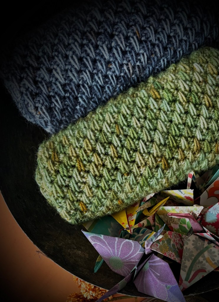 In my example, I used hand-dyed sock wool. This is Wool with Verve sock yarn in a ratio of 420 meters per 100 grams. I used the color 20242791. The crocheted examples are for my giant feet in shoe size 46, which used a total of 150 grams of sock wool for a pair.