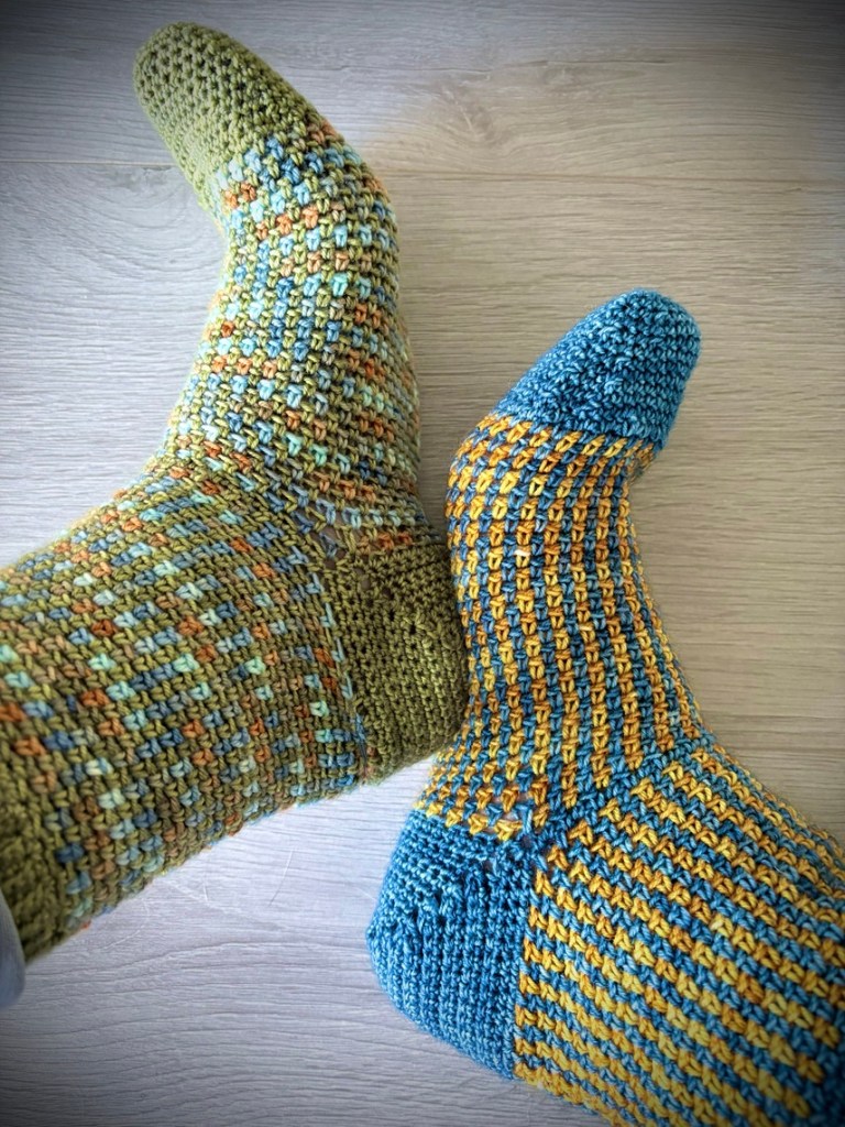 The amount of yarn required also depends mainly on your shoe size. Crocheting socks always requires more yarn than knitting socks, and a good benchmark is that you need one and a half times as much yarn for a crocheted sock as for a knitted sock. However, tests show that for this pattern up to a shoe size 40 (EU), you will need 100 grams of sock wool. Each size above that requires about 110-150 grams of sock wool. It also varies by the length of the leg and toe pieces you choose.