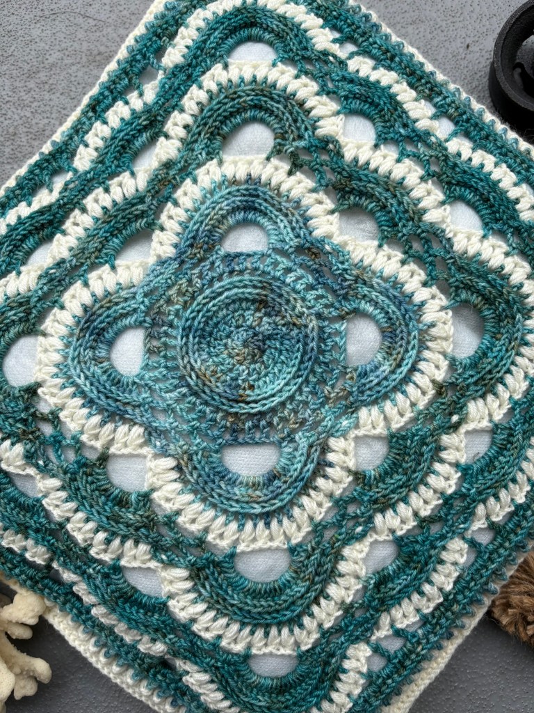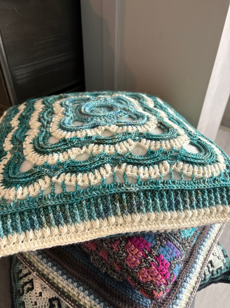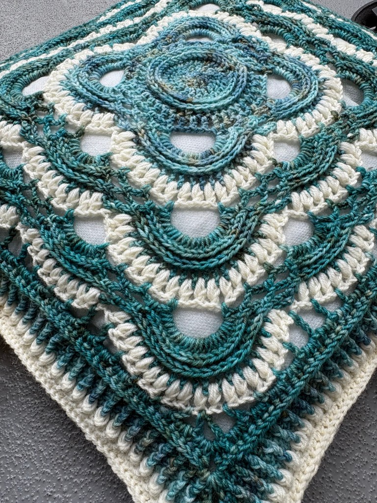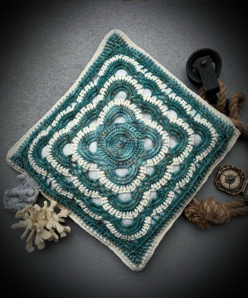 Oceanborn was a unique shawl pattern that I created with a challenge to myself in mind. I wanted to make a quality pattern for a set of hand-dyed sock yarns. Many of the designs for these yarns are intended only for knitting, and I wanted to make that change here. And so, I did! I took the ocean as an inspiration. The white foam on the rolling waves could be found in this shawl. Andā¦as I loved the outcome of this design so much, why not extend the pattern to a cushion? This wasnāt as easy as it seemed at first, but I succeeded. It is like an overview of the oceanās surface.