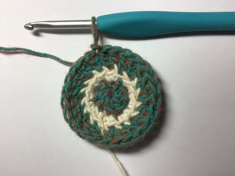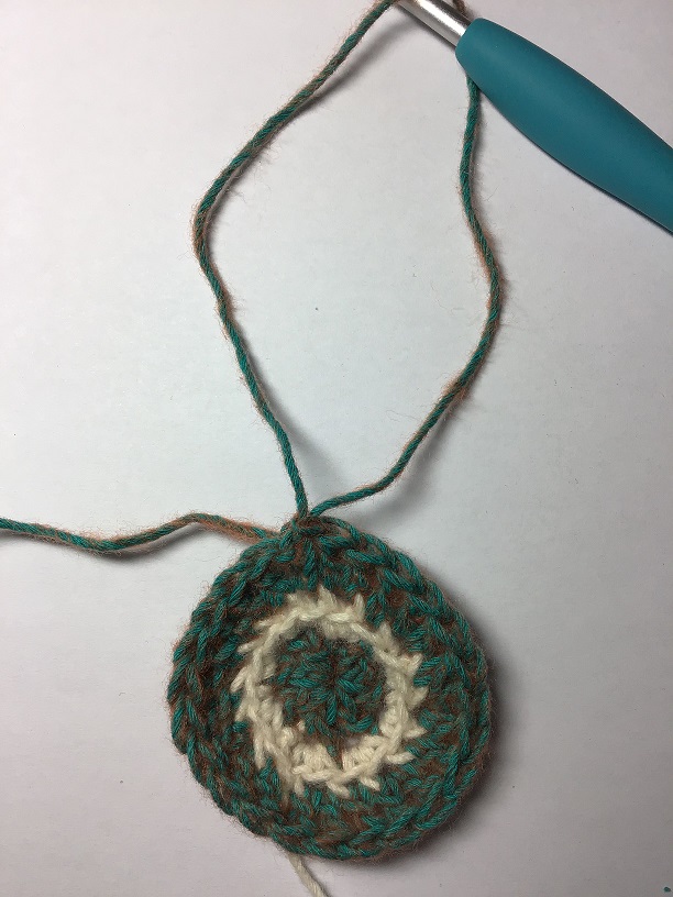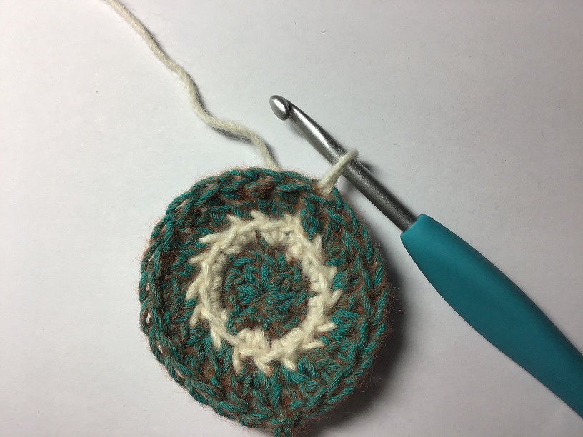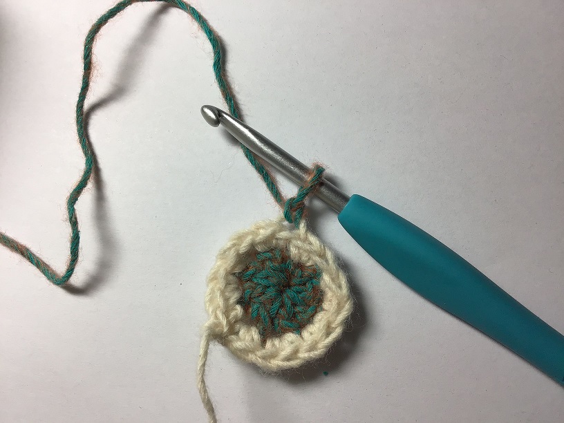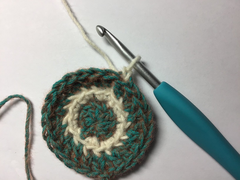 Now as you would have done this with the first color as well, you would still have a thread of the color hanging at your work a Round down. Take that Color thread up and with a slip stitch pull it up in the indicated stitch you want to start in.