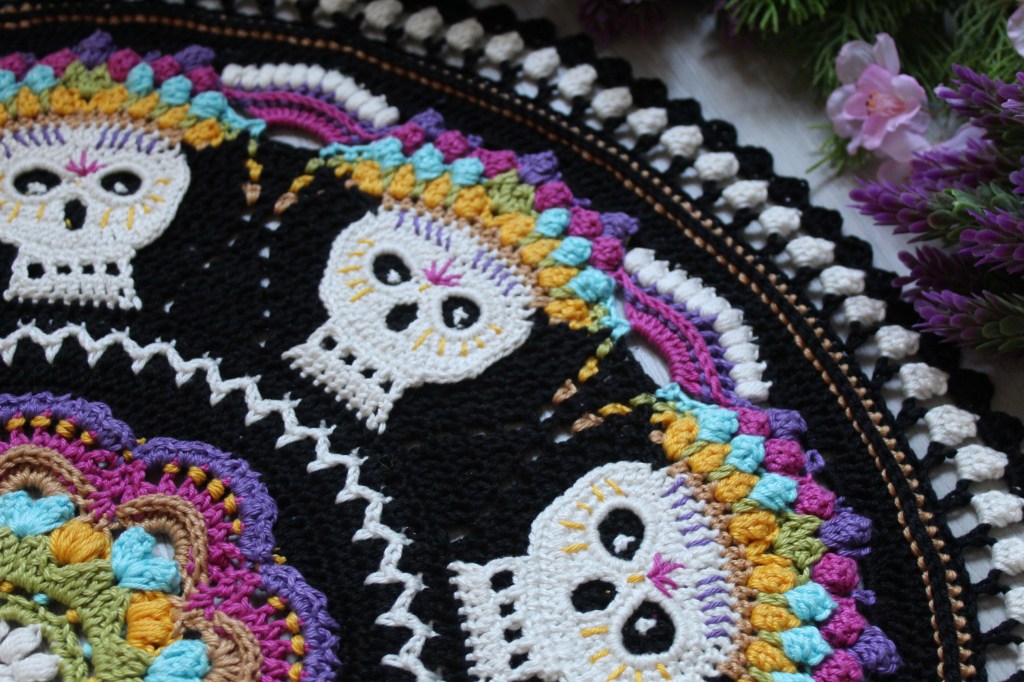 Welcome to Part 2 of the Dia de los Muertos CAL. This week we will start with the Black and Whites in the pattern. We will form a decorative stripe around our colorful center part. And we are crocheting the skulls as well this week ! Here are some details before you start Part 2 :