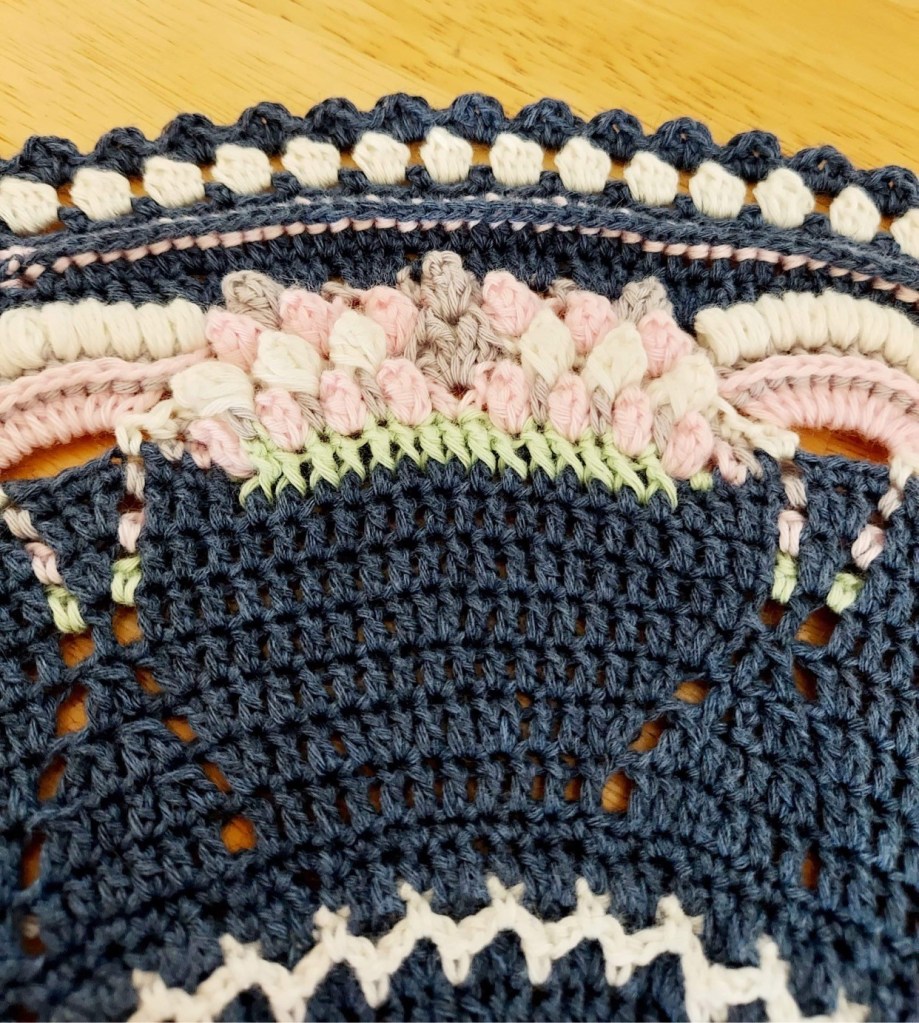 - When you decided to not make any skulls as the test version of my dear team member Tineke Tap ( see the example on the introduction page ), you have to do a few things different. First, the stitches in Round 21 you are suppose to crochet in the skull and Round 20 – you will crochet them only in Round 20. This is pretty obvious and might not give any trouble. Up til Round 28 you can just follow the pattern as there is no difference in skulls or no skulls. On Round 29 this is the same – there are 15 sts made in the skull but in this case you would just crochet them in the Round. In Round 30 things will go a bit different. The 15HDC you would make on the head of the skull will become 15 FPDC. This means you would make 1 Front post double crochet around the next 15 sts of Round 29 at the place where each skull would be. In this case you prepare your work to move along to the flower section once again without any skulls. Here is a photo which shows you how those fpdc’s might look when made.