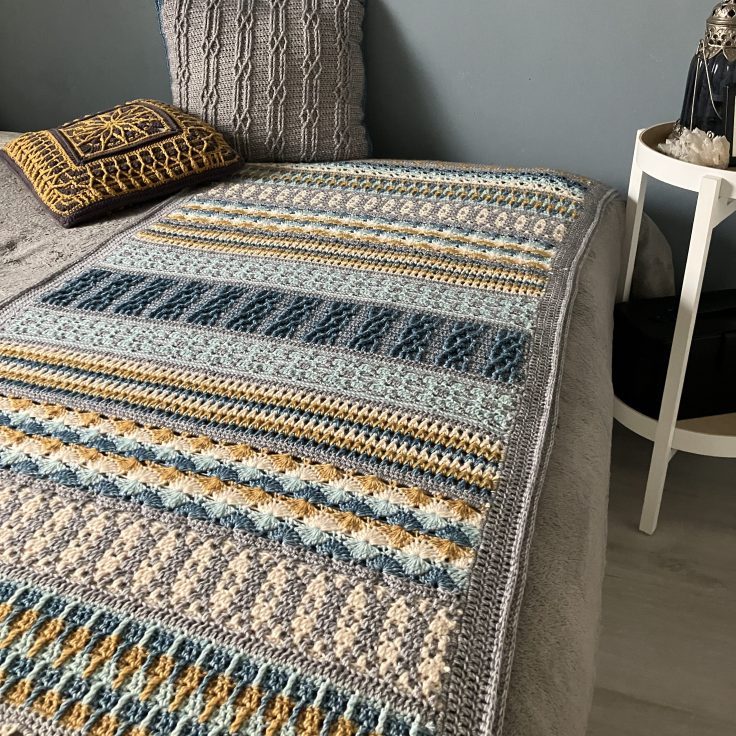 Page 72– In the yarn amounts there is a number missing at the first yarn color. This must be 2 hanks. Also, Scheepjes Skies Heavy is discontinued in the meantime and so the yarn isn’t available any longer. I recommend taking some blue and green shades of Scheepjes Terrazzo as it is pretty similar in look. You only have to take down your crochet hooks by a size.
