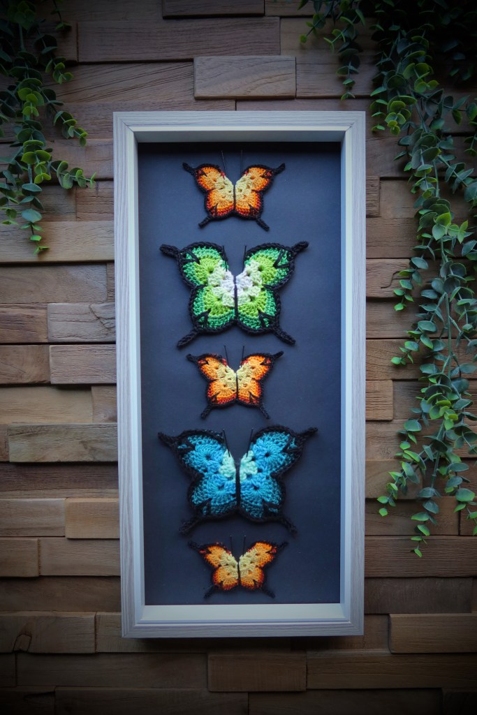 Yarn needed: I made three examples of the butterfly in different types of yarn and weights. You need a few grams of yarn for each color used – in every kind of yarn, so it is a great idea just to collect some scrap yarns and create a fun color set together. Ten grams of yarn for each color is always a safe amount of yarn to have.