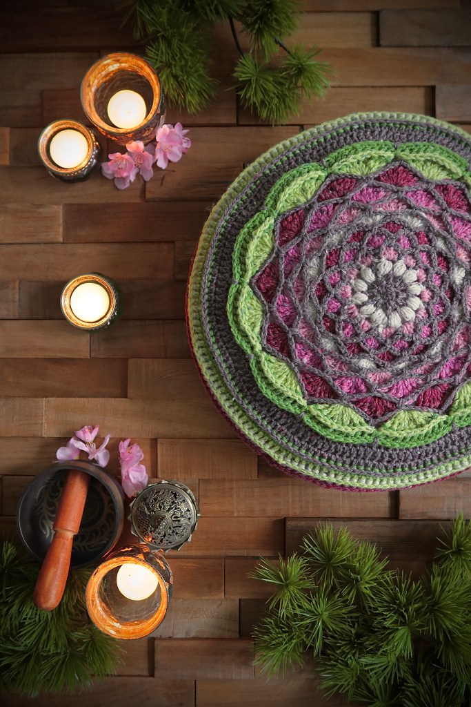 Size of project: The mandala’s diameter will be approximately 20 inches after blocking or crocheting it into a ring.