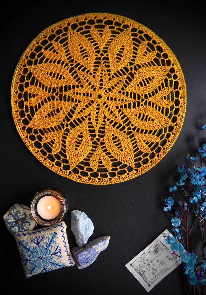 Size of project: The mandala’s diameter will be approximately 12 inches after blocking or crocheting it into a ring.