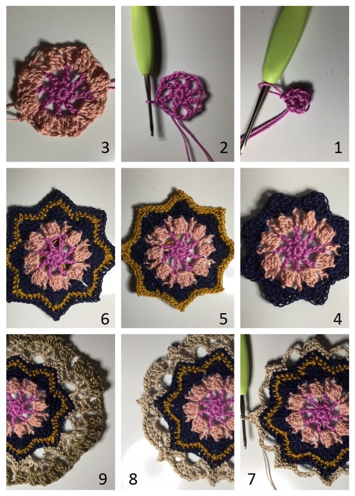 It is time to begin our exotic journey through spice markets and middle-Eastern parts of our world. We will start off with the centre of the blanket which is designed as a Persian eight-pointed star. A design that you will see in many designs in souks, ancient places and mosques.The centre of the blanket is also like the central marketplace where all colors, structures and shapes come together. It will be the eye-catcher of this pattern. Along the first three weeks you shall create the entire centre part, starting with this first part.