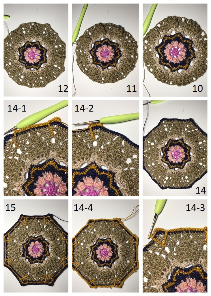 Round 10 : starting in first dc of a 3dc-gr – CH3 (first DC), 1DC in same st, CH2, sk st, 2DC in next st, CH1, (1PC in next ch1-sp between 2 pc’s, CH1) 3 times. * 2DC in first dc of a 3dc-gr, CH2, sk st, 2DC in next st, CH1, (1PC in next ch1-sp between 2pc’s, CH1) 3 times. Rep from * 6 more times. SS in top of first st. [8gr of 2DC-CH2-2DC/8gr of 3PC with ch1-sps between them]