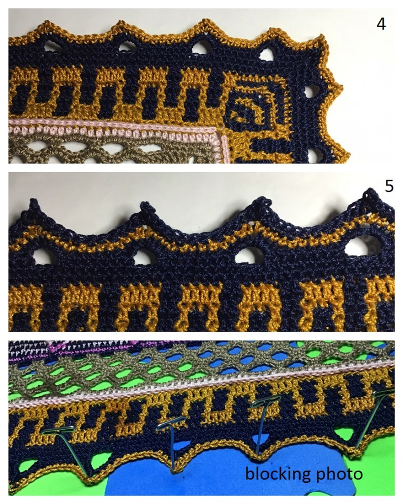 If you like a sharp and neat border you crochet all five Rounds above. If you like a more subtile and less pointy border you could also stop after Round 4. This is for example done in the Rosewater and Cinnamon version.