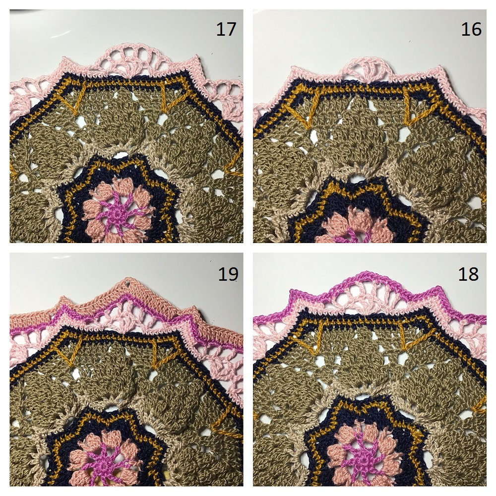 In the next Rounds your work can become a bit out of shape or not lay flat anymore. This is part of the pattern and later on this will solve itself, so no worries.