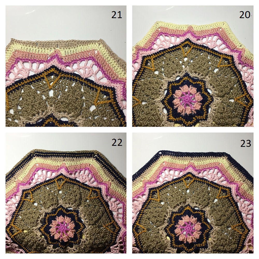 Round 21 : Take Color G and attach it in any ch1-sp. CH1 (doesn’t count as st), * {1SC-CH2-1SC} in ch1-sp, sk first st on side, 1SC in next 4 sts, 1HDC in next 4 sts, 1DC in next 5 sts, 2DC in next st, sk the ss in the ch2-sp, 2DC in next st, 1DC in next 5 sts, 1HDC in next 4 sts, 1SC in next 4 sts, sk last st on side. Rep from * 7 more times. SS in top of first st. Fasten off yarn. [8 sides of 5SC/4HDC/14DC/4HDC/5SC and a CH2-sp]