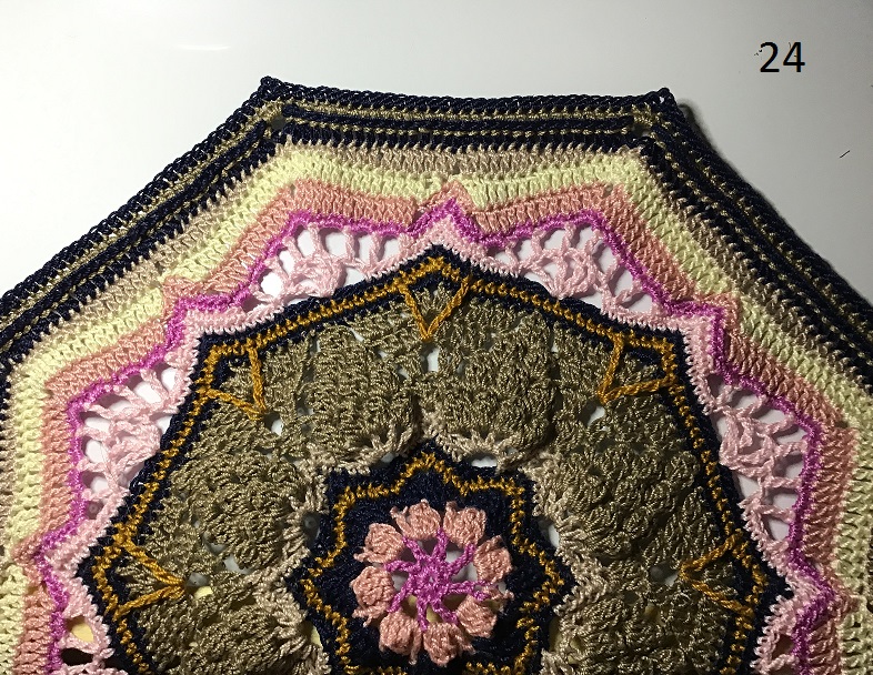 Round 23 : Take Color H and attach it in any ch2-sp. CH2 (first HDC), 2HDC in same sp, 1BPDC around next 30 sts, * 3HDC in next ch2-sp, 1BPDC around next 30 sts. Rep from * 6 more times. SS in top of first st. Fasten off yarn. [8 sides of 3HDC/30BPDC]