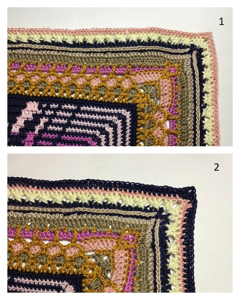 Round 1 (RS) : Take Color E and attach it in any ch2-sp. CH1 (doesn’t count as st), * {1SC-CH2-1SC} in ch2-sp, 1SC in each st along side til next ch2-sp. Rep from * 3 more times. SS in top of first st. Fasten off yarn. [4 sides of 176SC and 4 times a CH2-sp]