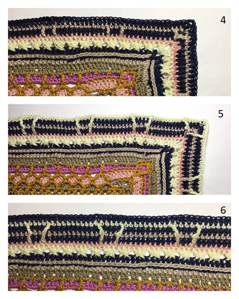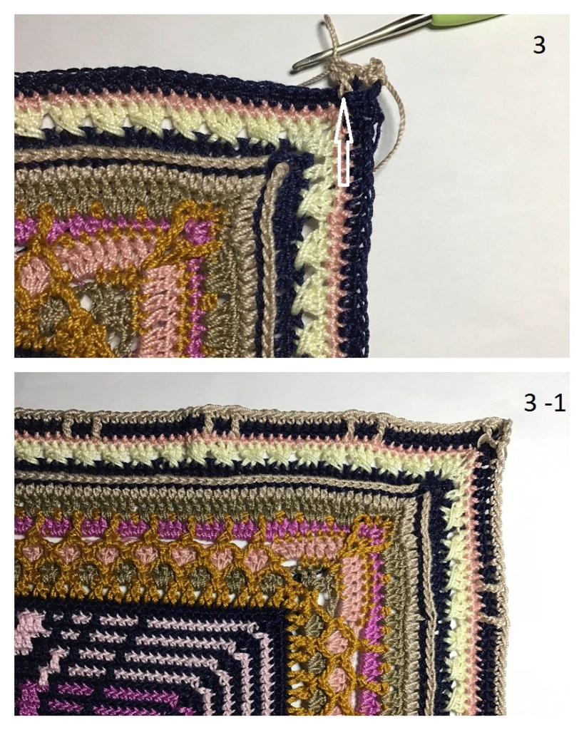 Round 3 : Take Color G and attach it in any ch2-sp. CH1 (doesn’t count as st), * {1SC-CH2-1SC} in ch2-sp, 1SC in next st, 1DC in ch2-sp of Round 1 ( see photo 3 ) , sk st, 1SC in next 11 sts, 1FPTR around st beneath it on Round 1, sk st, 1SC in next st, (1SC in next st, 1FPTR around st beneath it on Round 1, sk st, 1SC in next 11 sts, 1FPTR around st beneath it on Round 1, sk st, 1SC in next st) 10 times, 1SC in next st, 1FPTR around st beneath it on Round 1, sk st, 1SC in next 11 sts, 1DC in ch2-sp on Round 1, sk st, 1SC in next st. Rep from * 3 more times. SS in top of first st. Fasten off yarn. [4 sides of 158SC/2DC/22FPTR and 4 times a CH2-sp]