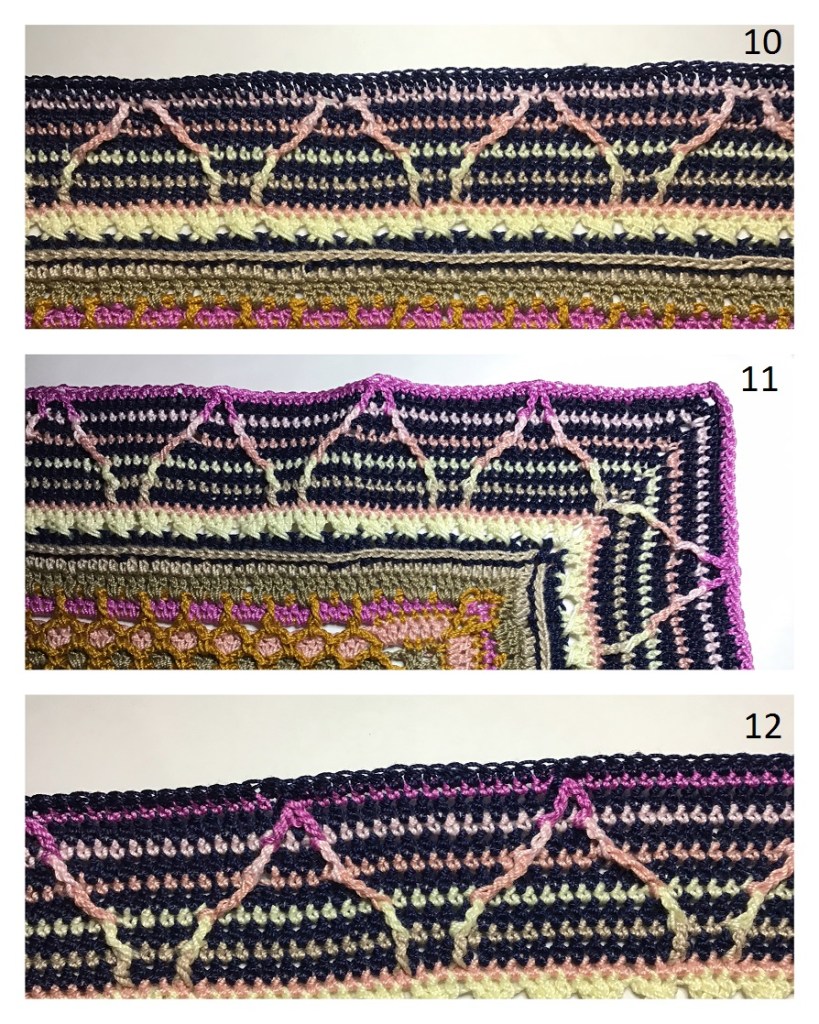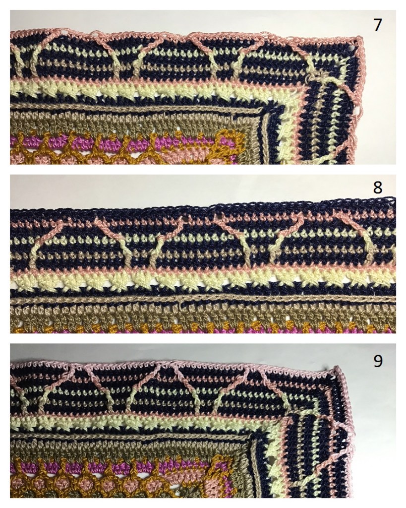 Round 9 : Take Color D and attach it in any ch2-sp. CH1 (doesn’t count as st), * {1SC-CH2-1SC} in ch2-sp, sk first st on side, 1SC in next 12 sts, (1FPTR around fpdtr of Round 7, sk st, 1SC in next st, 1FPTR around fpdtr of Round 7, sk st, 1SC in next 12 sts) 11 times, 1FPTR around fpdtr of Round 7, sk st, 1SC in next st, 1FPTR around fpdtr of Round 7, sk st, 1SC in next 10 sts, 2SC in next st. Rep from * 3 more times. SS in top of first st. Fasten off yarn. [4 sides of 170SC/24FPTR and 4 times a CH2-sp]